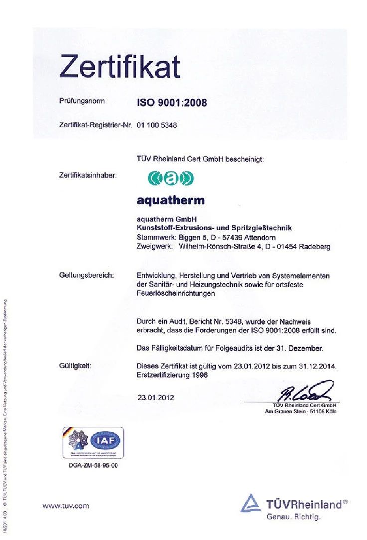 自1996年起aquatherm已經(jīng)符合了DIN ISO 9001質(zhì)量管理體系要求。2012年,認證的TUV認證得到了延伸,這是通過ISO 14001環(huán)境管理體系的認證。如今,通過了ISO 50001能源管理的認證。