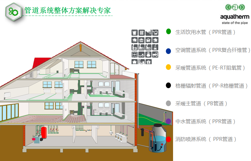 • 采暖主管及調(diào)水系統(tǒng)管道系統(tǒng) —PP-R符合纖維管aquatherm藍色管